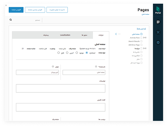 هنگام ایجاد یک صفحه جدید، علاوه بر تعیین نام و عنوان (که برای سئو نیز اهمیت دارد)، موقعیت آن در ساختار منوی سایت (به عنوان یک آیتم اصلی در ریشه یا به عنوان زیرصفحهای از یک صفحه دیگر) و مهمتر از همه، “مجوزهای” دسترسی (Permissions) آن مشخص میشود که تعیین میکند چه گروههای کاربری یا کاربران خاصی اجازه مشاهده (View) یا ویرایش (Edit) آن صفحه را دارند.