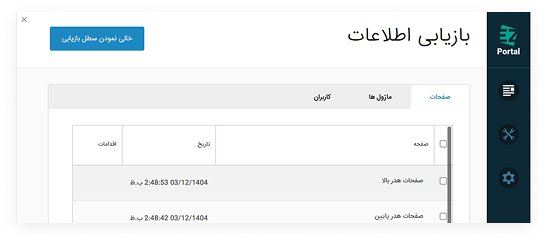 Section titled “قابلیتها”- جابجایی بین لیست صفحات، ماژولها و کاربران حذف شده