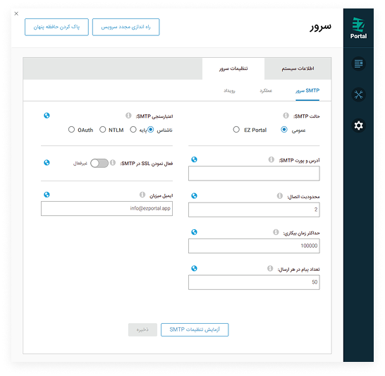 - پیکربندی سرور ایمیل: پیکربندی اطلاعات سرور ایمیل (SMTP) برای ارسال ایمیلهای سیستمی