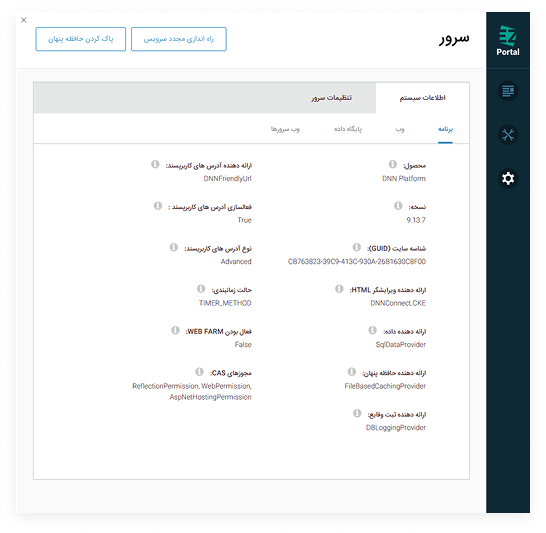 این بخش دارای دو تب اصلی است: تب اول، “اطلاعات سیستم” (System Information)، که صرفاً جنبه گزارشی داشته و اطلاعاتی درباره نسخه پلتفرم ایزیپورتال، مشخصات وب سرور (IIS) مانند نسخه سیستم عامل و فریمورک، و جزئیات پایگاه داده (مانند نسخه و ادیشن SQL Server) را نمایش میدهد و در محیطهای وب فارم، لیست سرورها را نیز نشان میدهد.