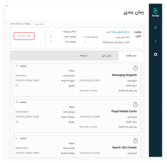 Section titled “معرفی بخش زمانبندی”بخش “زمانبندی” یا “اسکجولر” (Scheduler) در ایزیپورتال، که از طریق منوی “تنظیمات” در بخش مدیریت سایت قابل دسترسی است، سیستمی برای اجرای خودکار عملیاتهای مختلف سایت در بازههای زمانی معین و بدون نیاز به دخالت مستقیم کاربر میباشد.