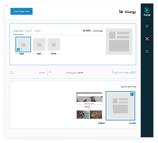 Section titled “انتخاب پوسته فعال”- انتخاب پوسته: انتخاب و فعالسازی پوسته یا قالب گرافیکی اصلی سایت